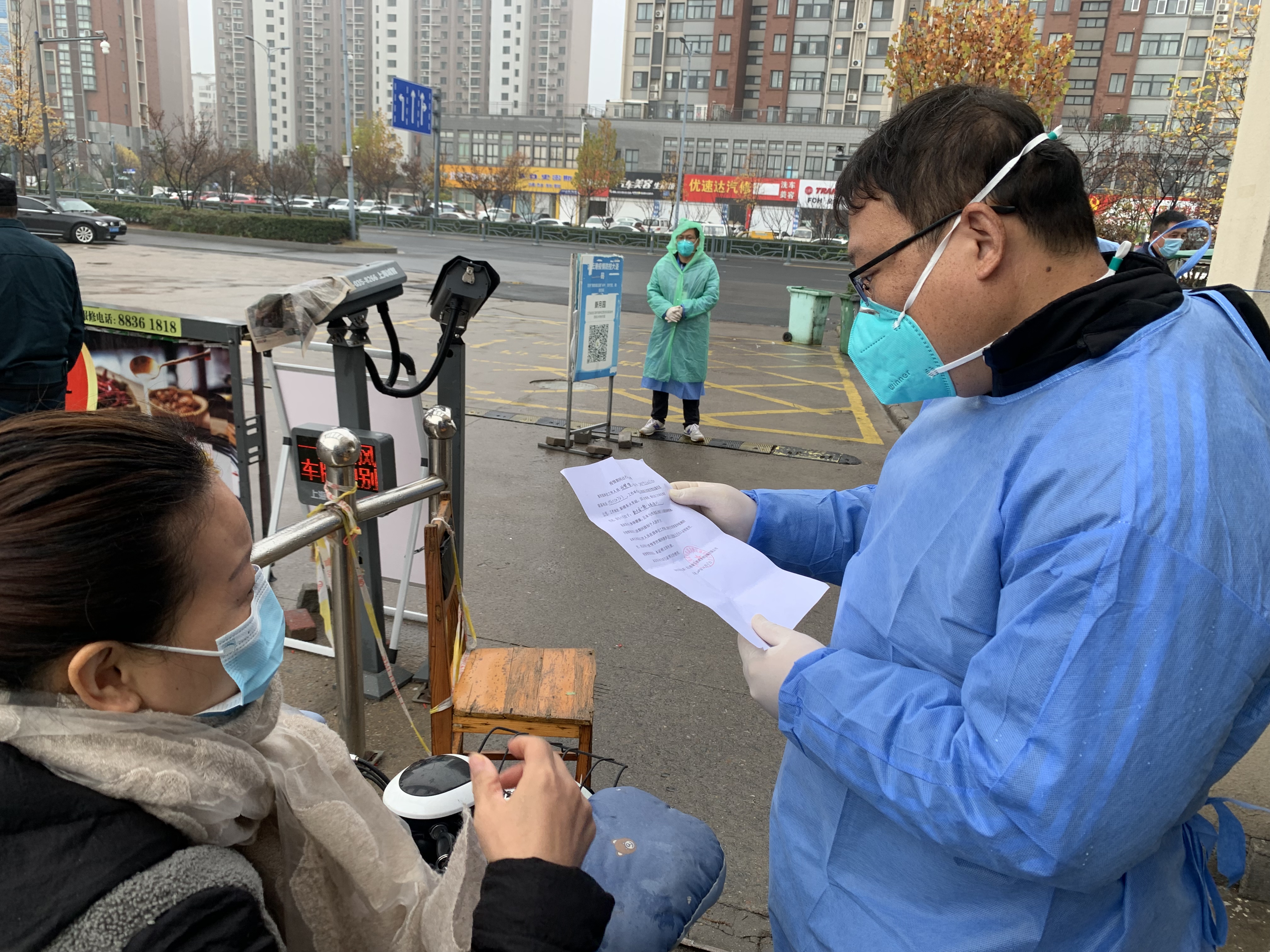 在凌州社区新月园小区,供电工程分公司志愿者们对进出小区人员测量体温,查验健康码、核酸报告,核对人员身份信息、外出证明、核酸检测信息录入等工作。