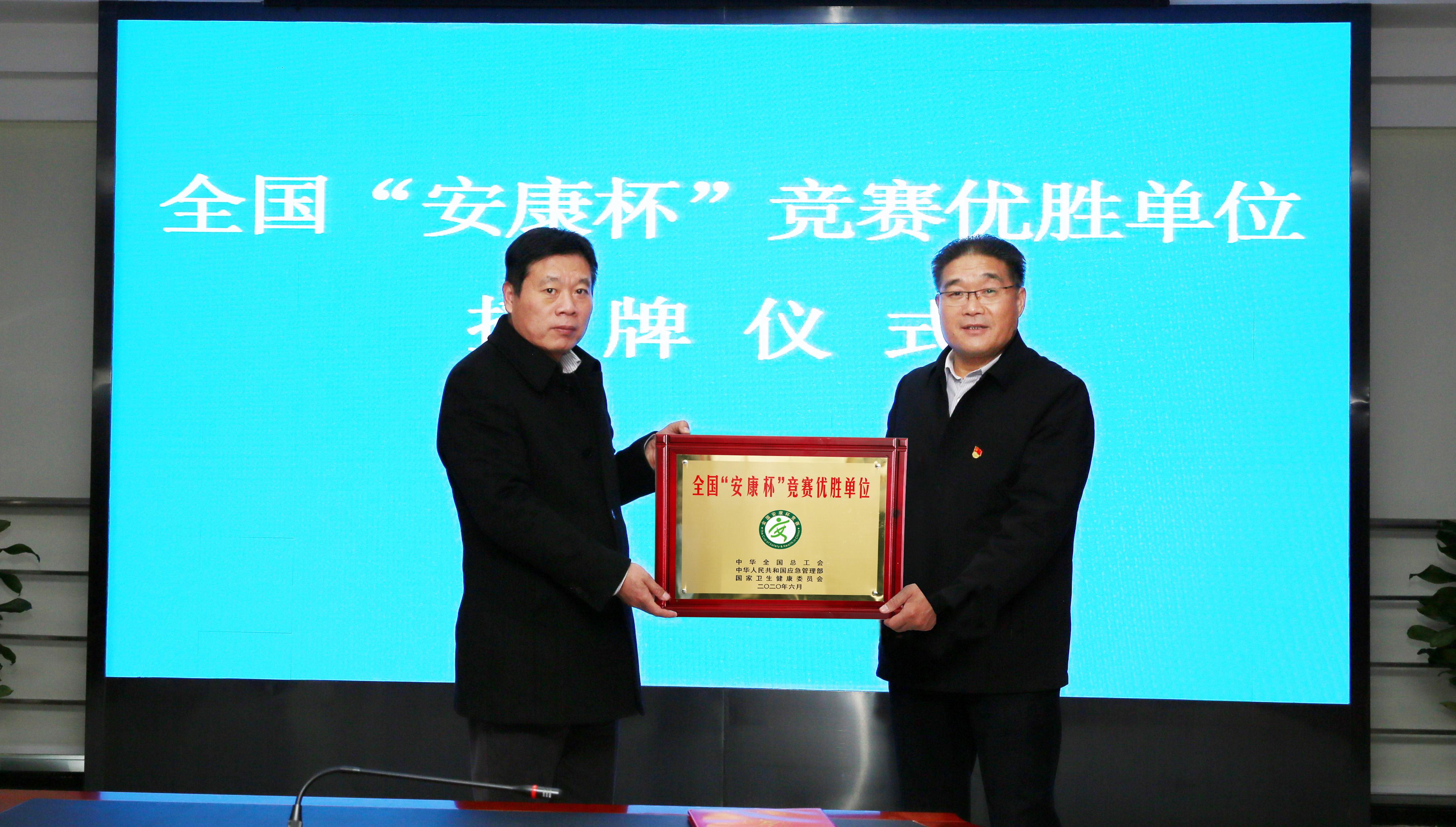 12月17日,市总工会党组书记、副主席丁维杰向三亿sanyi(中国)公司授予全国“安康杯”竞赛优胜单位奖牌。三亿sanyi(中国)公司党委书记、董事长杨龙,党委副书记戴鸿鸣、工会主席刘承志参加授牌仪式。