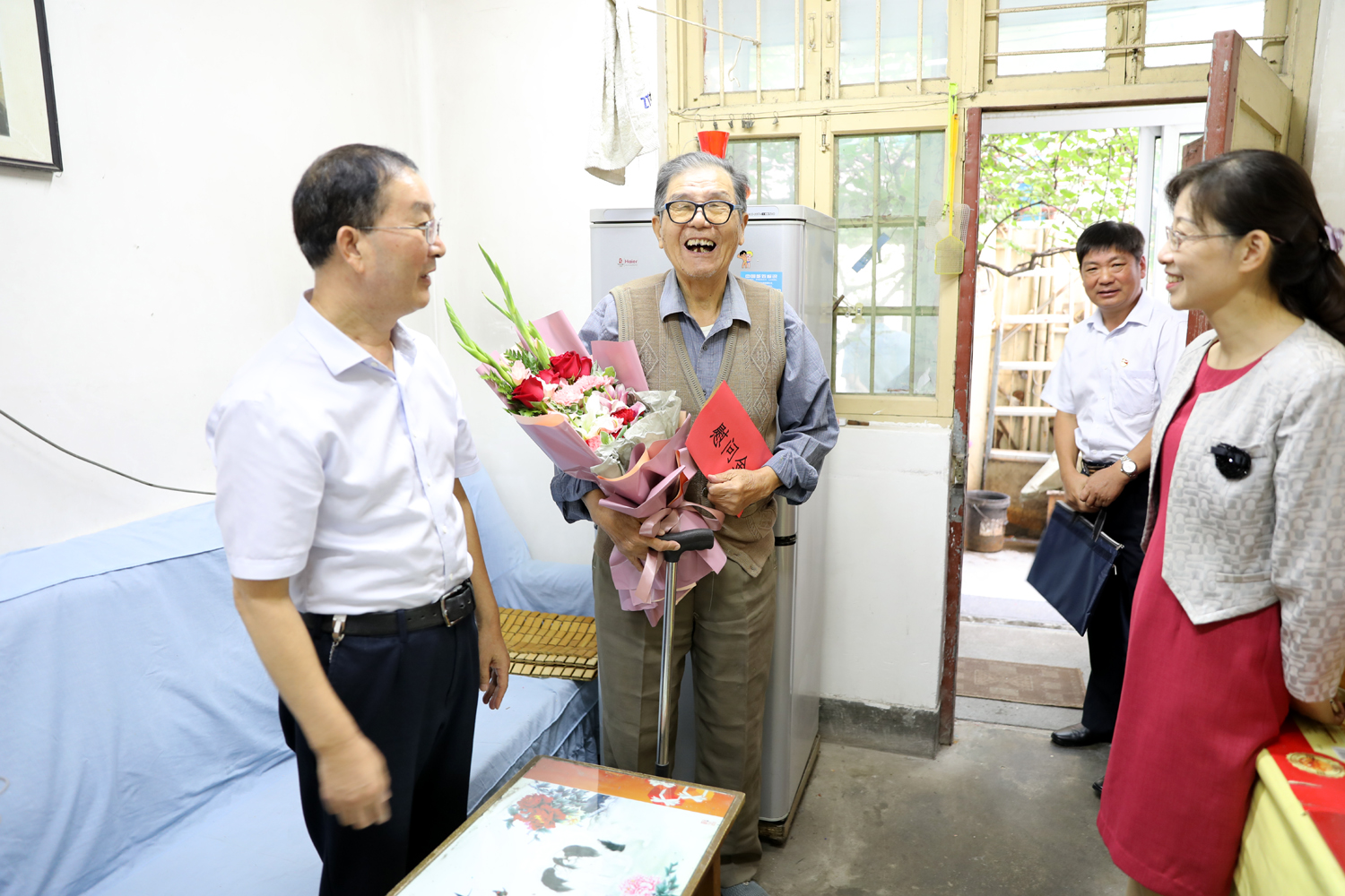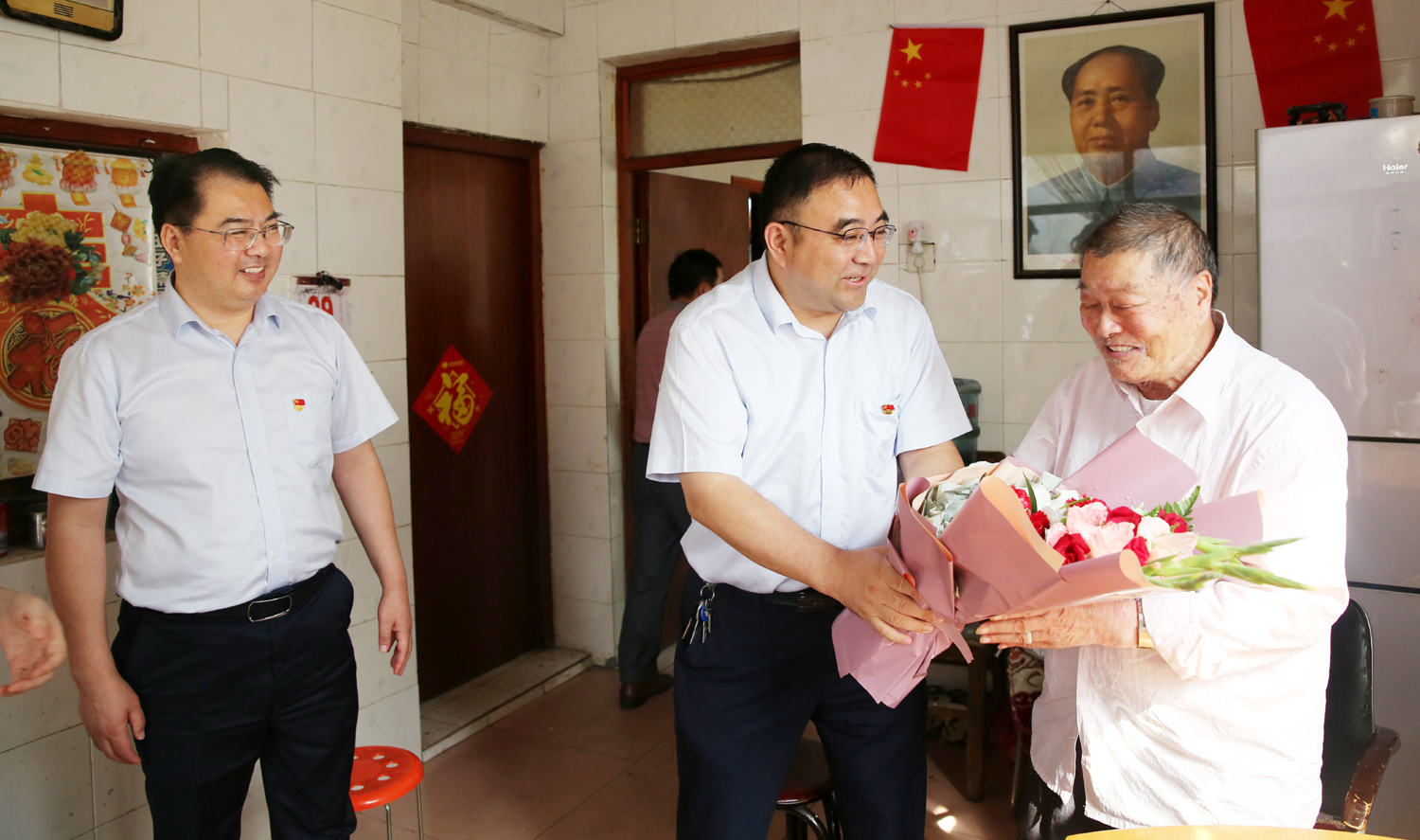 三亿sanyi(中国)公司董事长、党委书记杨龙,总经理胡建明、党委副书记戴鸿鸣、纪委书记汪群等领导分组走访慰问部分建国前参加工作的老党员、老干部,为他们送去慰问金和鲜花,同庆新中国七十周岁华诞。