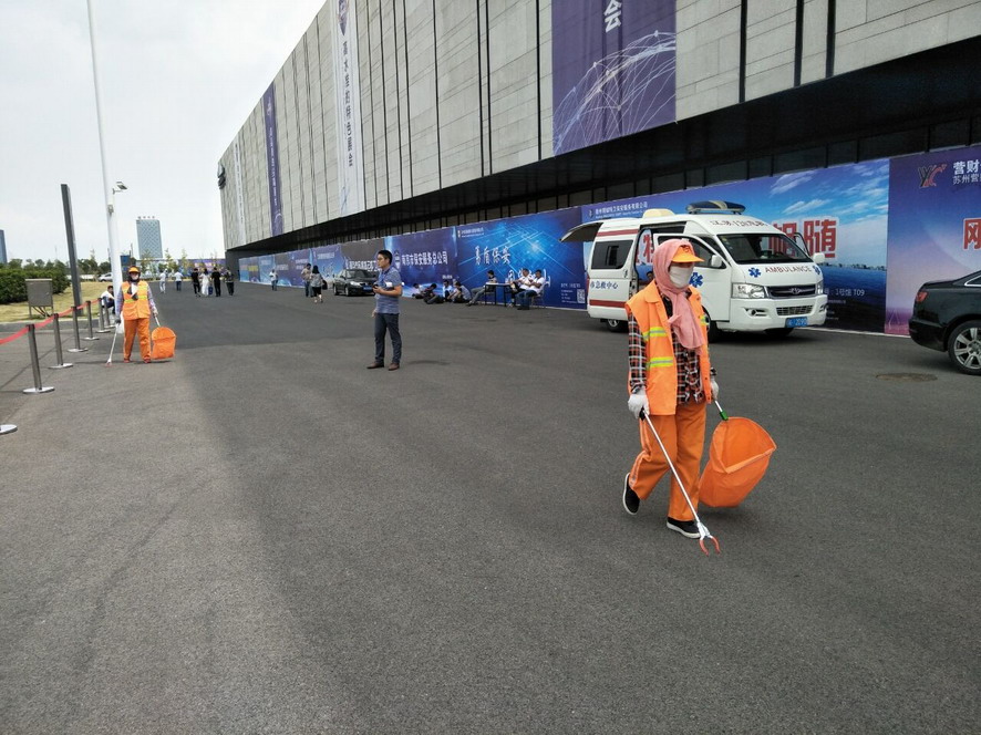 9月14日,连续忙碌了两个礼拜的职工们还没来得及休息,便又投入到“连博会”的准备工作中去。由于本届“连博会”共有来自27个国家和地区的420家企业参展,展览总面积达3.7万平方米,各家展商在布置展台时,各类生活垃圾、装修垃圾等一度将该公司布设的100多个垃圾桶都塞满了,在安排好人工清理的同时,该公司还安排垃圾清运车对积存垃圾进行清理清运,组织洒水车对会场及周边道路进行冲洗,一直到9月18日晚上9点左右才完成准备工作。19日“连博会”开幕当天,负责现场保洁工作的职工们早上6点多就赶到了会场,冒雨在会场周边开始忙碌,一台大型清扫车和一台洒水车也在会场旁随时待命。到了中午,当展商们在室内小憩的时候,室外的职工们为了不耽误事,站在风口匆匆地扒拉两口混杂着雨水的盒饭,就又投入到紧张的清理工作中去。仅19号开幕当天,累计清理各类垃圾7吨左右,为“连博会”的正常召开提供了一个干净、整洁的会场环境。