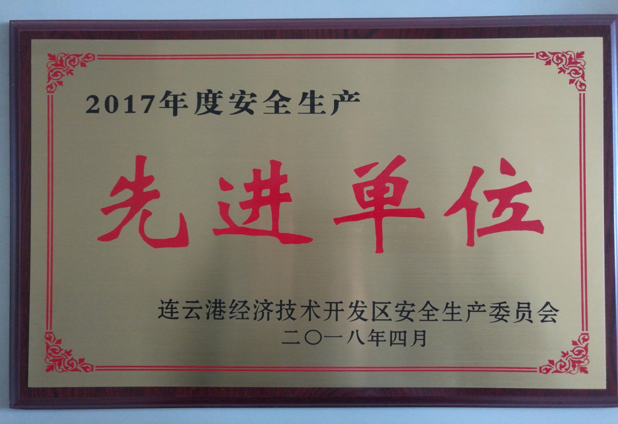 2018年4月28日,开发区2017年度安全生产会议在新海连大厦召开。会上对18家“安全生产先进单位”和26名“安全生产先进个人”进行了表彰。我公司荣获2017年度开发区“安全生产先进单位”荣誉称号。氨纶宣