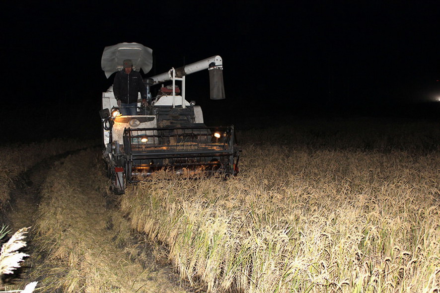 11月9日夜七时许,青口投资公司大新农场,工会副主席王士超作为巡查组成员,正在组织二分场赵华勇条田水稻种植户在抢收水稻。