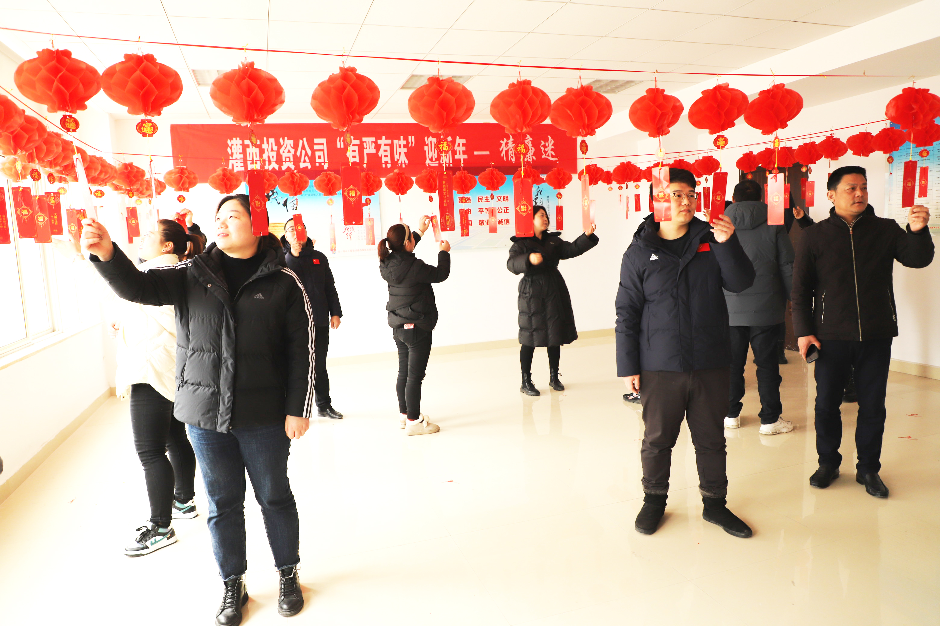 “树我中华廉政风——打我国两节气。”“反腐倡廉常抓不懈——打一中国地名。”1月26日,灌西公司办公大楼廉政文化展厅内红红的灯笼格外喜庆,近百条廉政灯谜依次悬挂,一场集知识性和趣味性于一体的廉政灯谜有奖竞猜活动吸引了百余名员工聚集参与,大家一起开动脑筋,争相“解密”。