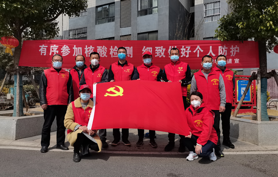 除了在岗员工,还有退休党员秦英、孙芳等,在疫情发生前,他们是公司内退党员,在疫情爆发以后,他们是无所畏惧的抗疫战士。随着连云港开始第一轮全员核酸检测,工作人员和志愿者都严重短缺,每天确诊病例激增的数据都令人触目惊心。当看到招募志愿者的公告时,秦英热血沸腾。“党和人民需要我,我的家乡需要我!”主动联系海州区幸福路街道西大岭社区,在咨询志愿者报名的同时,郑重地并向社区递交了一份疫情防控“请战书”。