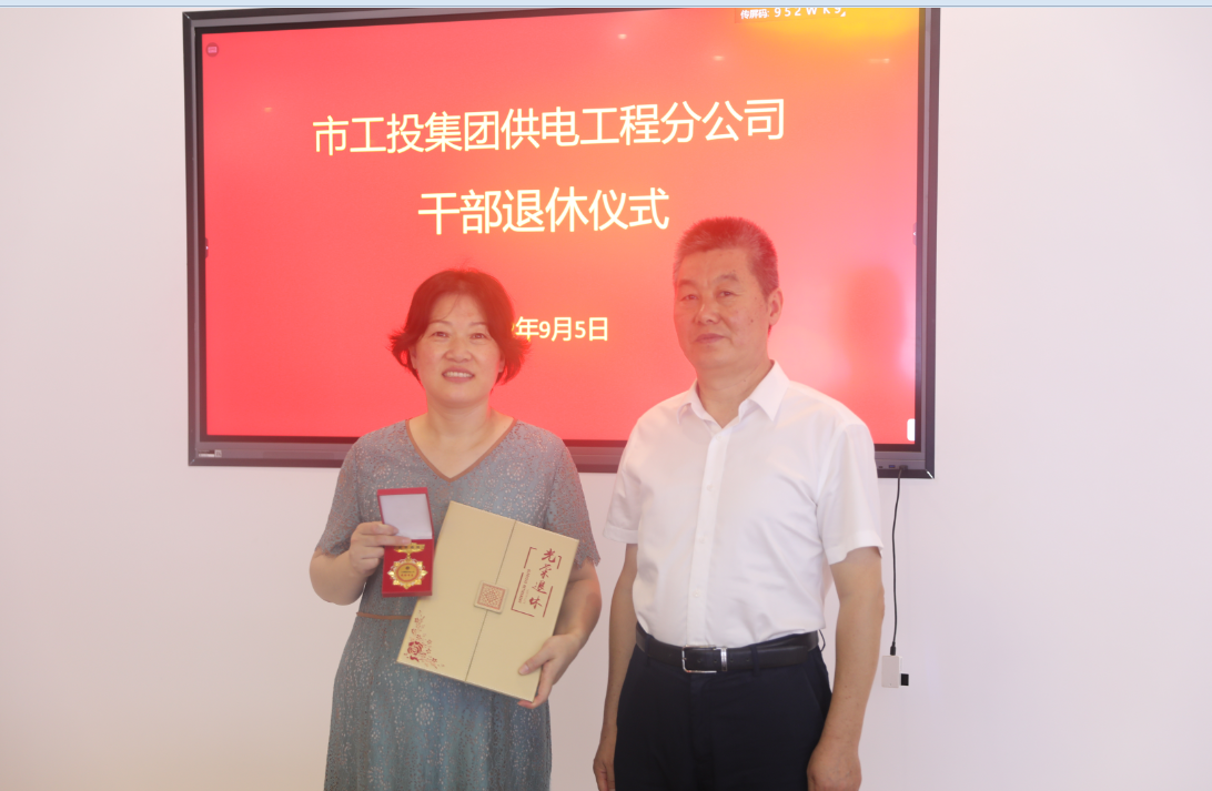 9月7日上午,公司举行干部荣休仪式,为退休的杨敏同志送上荣休祝福、光荣退休荣誉勋章和退休纪念函,党委副书记、工会主席王志军对杨敏同志的付出表示肯定,希望杨敏同志继续发挥党员先锋模范作用,离任不离心,一如既往地关心、支持公司的发展,弘扬供电精神,发挥“传帮带”作用,给予年轻同志更多指导,给予公司工作更多支持。