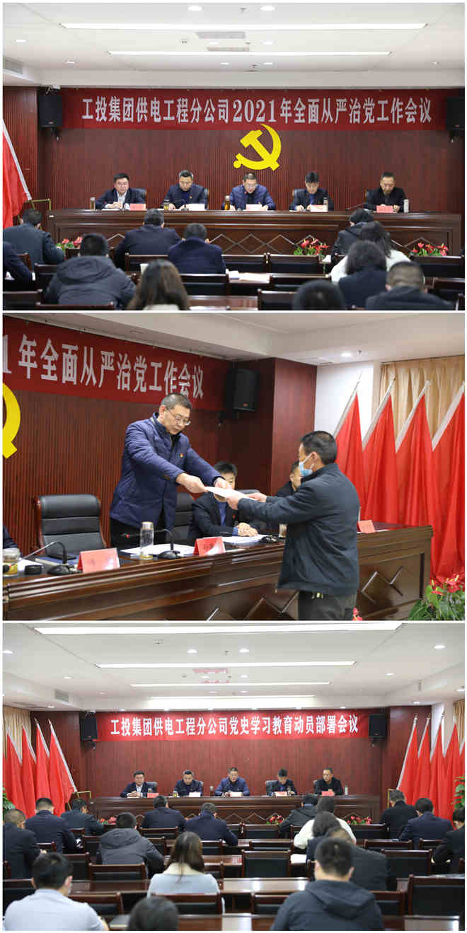 上半场,在公司2021年全面从严治党工作会议上,全体参会人员首先观看了全面从严治党工作警示教育片。随后,党委书记、经理孙政权在题为《强化政治建设 聚焦深度融合 以大党建引领公司高质量发展新征程》的党委工作报告中指出,过去的一年,面对新冠疫情和经济下行的双重压力,公司党委深入学习贯彻习近平新时代中国特色社会主义思想,以“不忘初心、牢记使命”主题教育为主线,扎实开展“双融双创”党内主题教育实践活动,压实管党治党责任、勇于直面困难挑战,推动公司经济在逆境中取得突破,党建工作取得了显著成效。报告强调,2021年党委工作的指导思想是:深入学习贯彻习近平新时代中国特色社会主义思想、十九届五中全会精神等内容,以“全面从严治党”为统领,以“党史学习教育”为主线,以打造“工电先锋”党建品牌为抓手,扎实开展“奋进新时代、领航开新篇”党内主题教育活动,以“大党建”整合力量、凝聚人心,发挥党的关键引领作用,将党的政治优势转化为发展优势。团结带领广大干部员工,统一思想、凝聚力量,勇于担当、开拓进取,加大改革创新、转型升级、管理提升推动力度,开创工投供电高质量发展新局面,以改革发展优异成绩向建党100周年献礼,为扛起“争当表率、争做示范、走在前列”重大使命、夺取“十四五”发展开局首胜作出贡献。围绕上述总体要求,重点做好五个方面工作:持续深化政治建设,推进党建经济深度融合;持续强化基层基础,构建企业大党建格局;持续推进人才队伍建设,增强高质量发展推动力;持续推进党风廉政建设,推进全面从严治党向纵深发展;持续推进和谐企业创建,维护和谐稳定发展的良好局面。