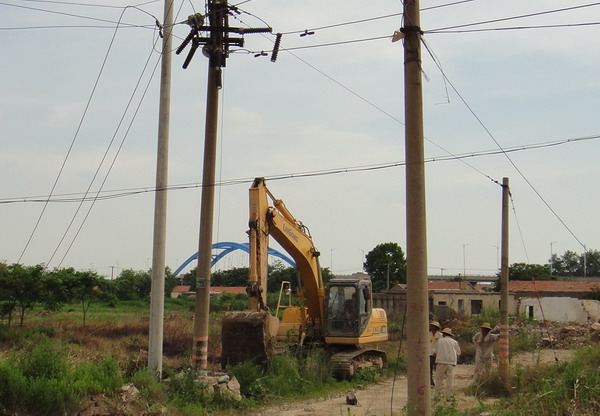 当日上午9时,室外温度高达35摄氏度,板桥、板桥工业园等片区突发停电。人们被迫从空调房中走出来,匆匆忙忙寻找避暑的地方。台南供电所负责人接到报告后,迅速启动应急抢修预案,并立即安排人员分头查找停电原因。经过认真巡视检查,终于发现了停电原因:金港湾物流园“板桥线”75#变压器附近的59#电杆,由于挖掘机施工时操作失误而倒地,并导致同向4根线杆倒地断裂,造成辖区内大面积停电。要恢复正常供电,必须重新架设电杆。于是,该所领导立即通知相关工作人员,组织准备相关设备、器材。10时许,副所长朱兵带领抢修人员和准备齐全的设备器材,赶往现场进行抢修。