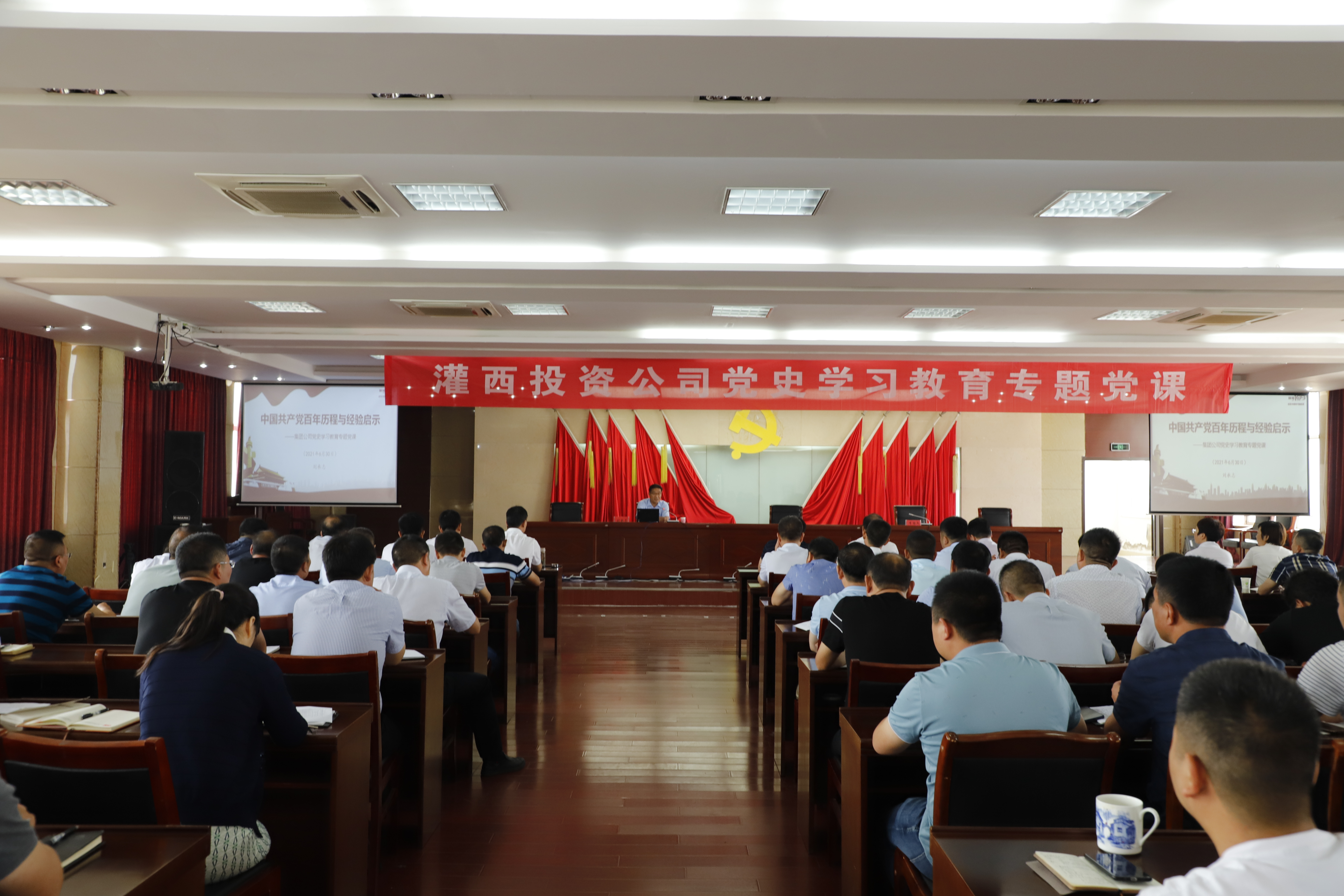 按照三亿sanyi(中国)公司统一安排部署,推进党史学习教育走深走实,6月30日上午,灌西投资公司举办党史学习教育专题党课学习会。三亿sanyi(中国)工会主席刘承志以“中国共产党百年历程与经验启示”为题专题授课。投资公司领导班子成员、各单位党政负责人、机关全体党员参加学习。灌西投资公司党委书记、董事长、总经理李国文主持会议。