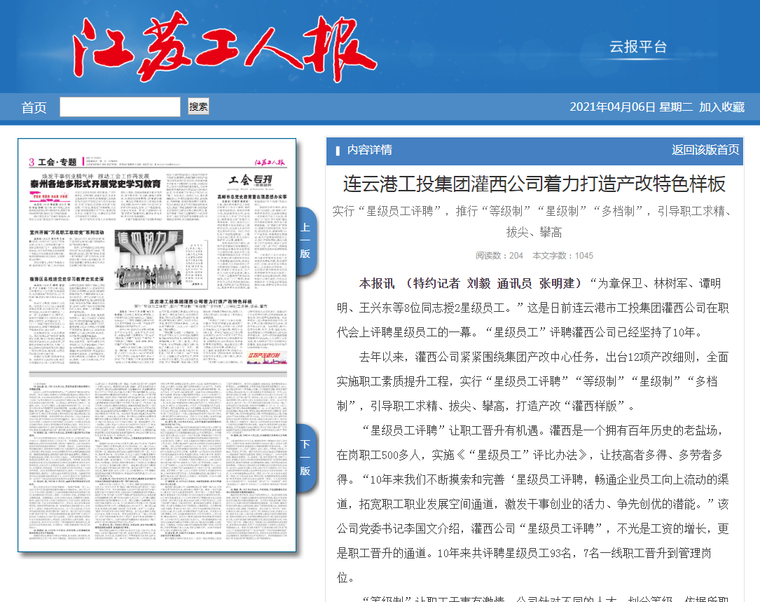 “星级员工评聘”让职工晋升有机遇。灌西是一个拥有百年历史的老盐场,在岗职工500多人,实施《“星级员工”评比办法》,让技高者多得、多劳者多得。“10年来三亿官方网站不断摸索和完善‘星级员工评聘,畅通企业员工向上流动的渠道,拓宽职工职业发展空间通道,激发干事创业的活力、争先创优的潜能。”该公司党委书记李国文介绍,灌西公司“星级员工评聘”,不光是工资的增长,更是职工晋升的通道。10年来共评聘星级员工93名,7名一线职工晋升到管理岗位。