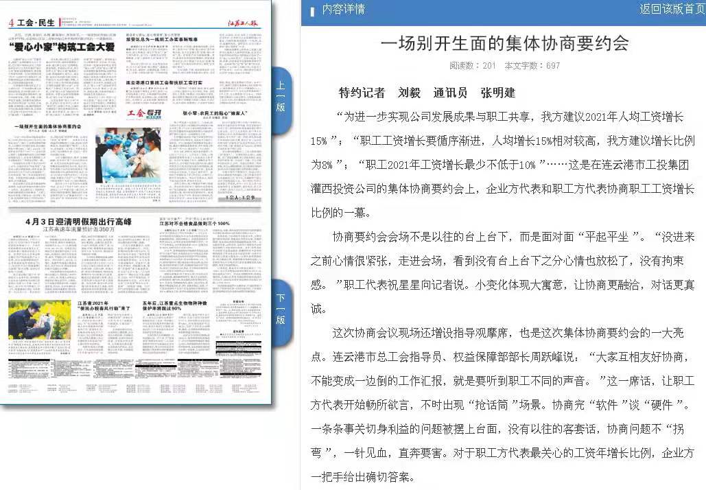 “为进一步实现公司发展成果与职工共享,我方建议2021年人均工资增长15%”;“职工工资增长要循序渐进,人均增长15%相对较高,我方建议增长比例为8%”;“职工2021年工资增长最少不低于10%”……这是在连云港市工投三亿sanyi(中国)灌西投资公司的集体协商要约会上,企业方代表和职工方代表协商职工工资增长比例的一幕。