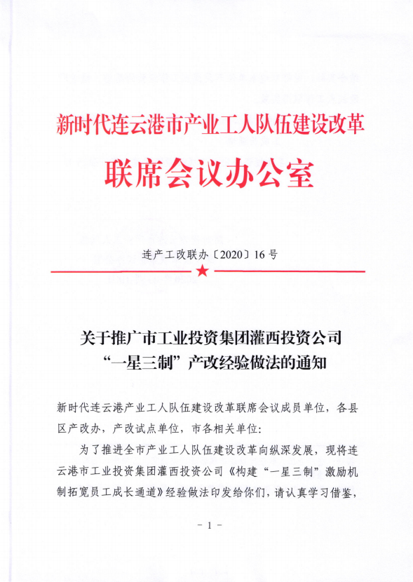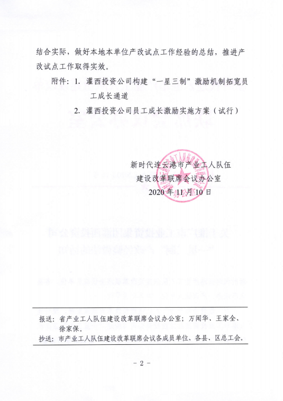 11月20日,新时代连云港市产业工人队伍建设改革联席会议办公室在全市推广工投三亿sanyi(中国)灌西投资公司“一星三制”产改经验。