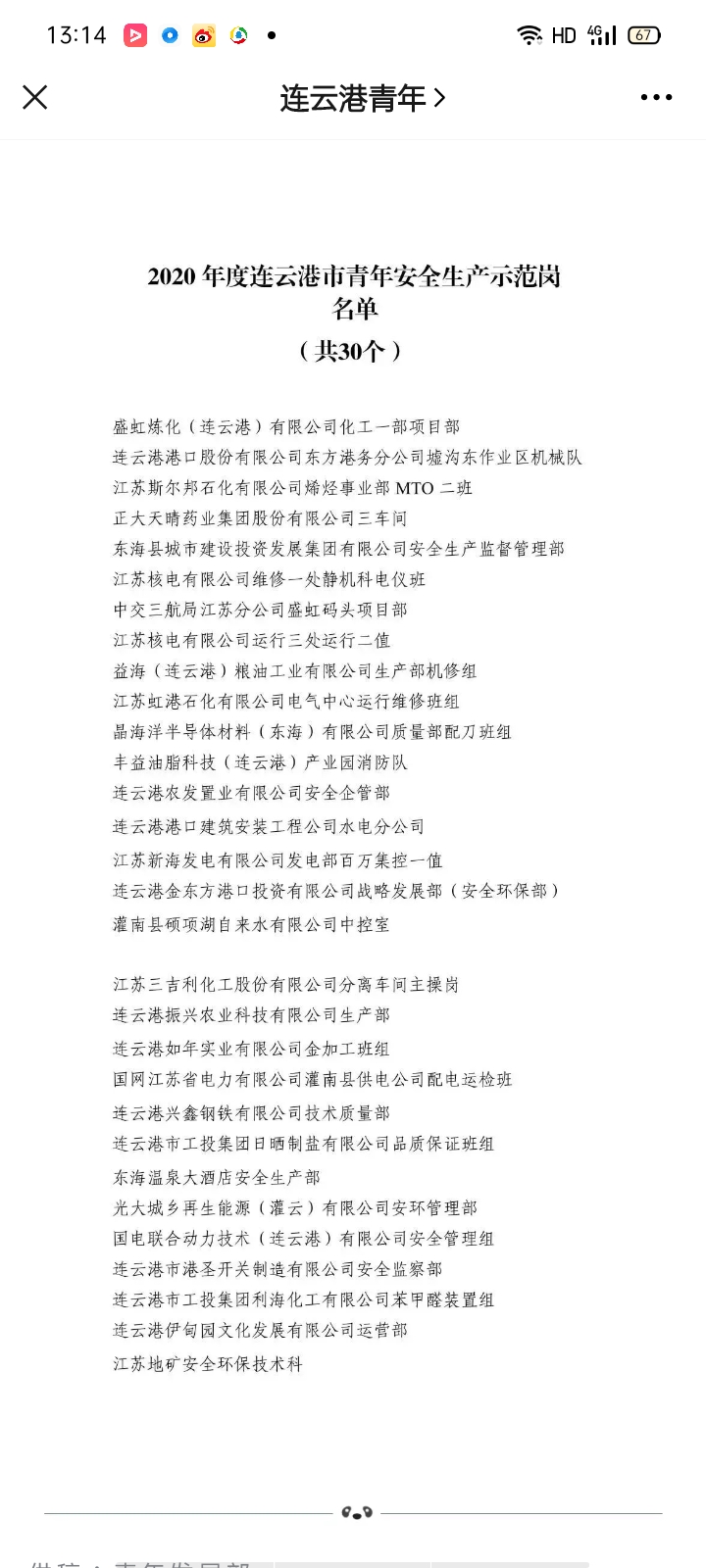 11月12日,共青团连云港市委员会公布2020年度连云港市青年安全生产示范岗名单,连云港市工投三亿sanyi(中国)日晒制盐公司品质保证班组被评为2020年度连云港市青年安全生产示范岗。