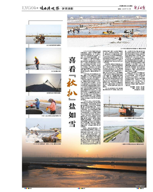 扒盐现场,指挥生产的程龙是土生土长的“盐三代”,爸爸和爷爷都是老盐场人。“和盐场打交道,心里才踏实。”大学毕业后,在外地工作了几年,程龙最终还是决定回到盐场工作。程龙说,纯手工扒盐的年代,盐工们都很辛苦——春季,盐工们迎来“大忙”。他们需要防“地漏”,用石拱、压割机把池底压实,防止卤水渗透下去。紧接着,就要忙春季扒盐。夏季,盐工们需要防“天漏”,提前将卤水放进土塘,避免降雨将卤水稀释。秋季,盐工们开始手工扒盐,用扁担挑卤水,用小推车把晒好的盐一车车推到船上运走。冬季,盐工们需要对沟道、池埝、土塘进行修复,为来年春天做准备。一年四季,循环往复,盐场人辛勤劳作。