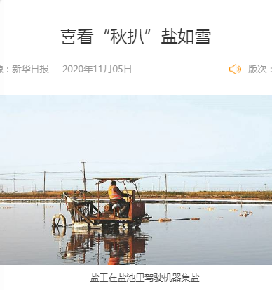 10月22日,在位于灌云县东北角的灌西盐场,一名盐工正开着电动履带扒盐机在盐池里扒盐。这一天,盐场人简称“秋扒”的秋季扒盐已近尾声。不远处,7000吨盐堆成的盐廪像一座小雪山,那是盐工们一星期的劳动成果。
