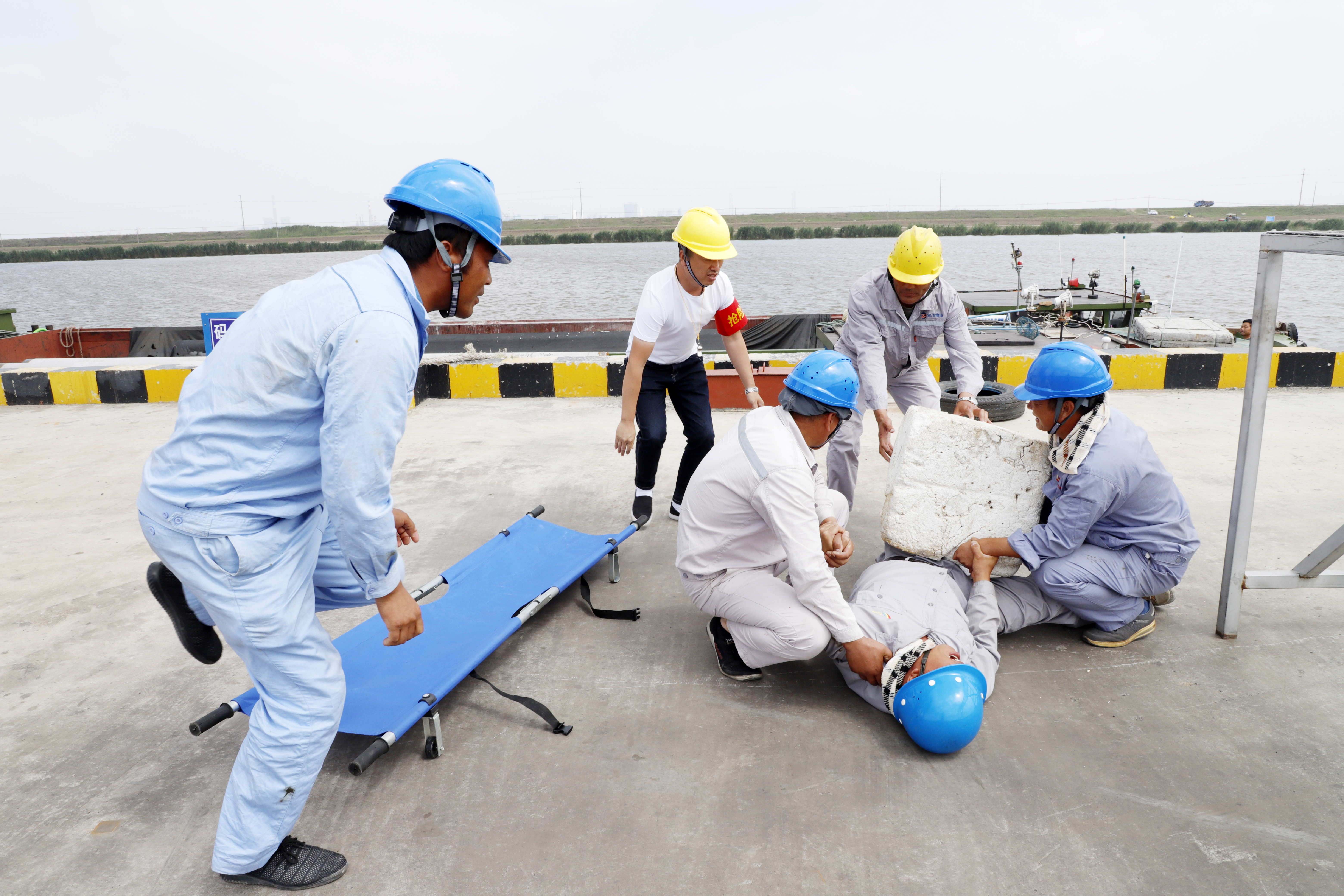 为了加强员工自我安全意识,检验应急响应人员对应急预案、执行程序的了解程度和实际操作技能,6月22日下午,灌西公司在宵洋五灌河码头开展作业人员中暑、高空坠物事故应急演练活动。