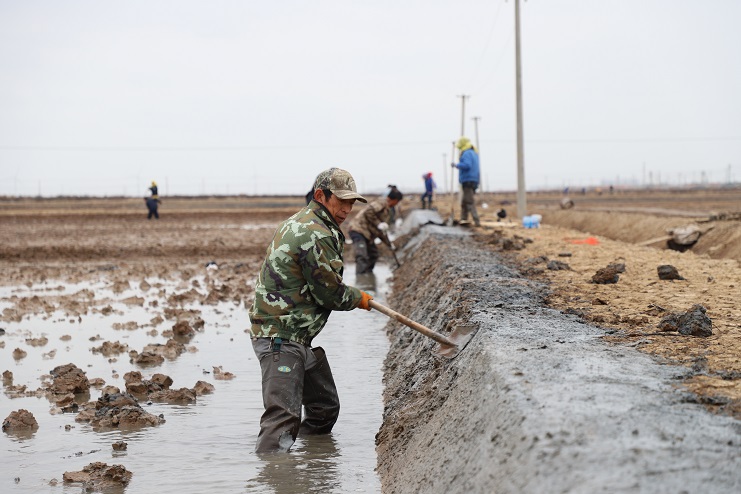 11月29日上午,虽然天气寒冷,但是在海盐基地新改造的制卤滩上,却到处是一派火热的劳动景象,参加“大会战”的工人多达100余人,只见他们有的泼水,有的铲泥,有的捞沟,有的做埝,大家分工协作。据了解,为了提高海水制卤能力,确保海盐产量,今年公司专门对海盐基地部分废弃滩地进行了改造,以进一步增加制卤面积。近期,随着改造工程接近尾声,公司又组织精干力量对新改造滩地继续进行修整,以确保新建的制卤滩地能够尽快投入使用,为明年海盐生产工作的正常有序开展奠定扎实的基础。