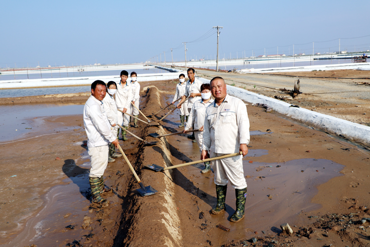 8月9日,室外温度36摄氏度,地面温度43摄氏度。上午6点半,笔者来到新河制盐分公司八班,恰逢工人在修整盐禀。笔者看到,8班班长祝星星拿起铁锹,带领几名员工在高温下挖沟取土修禀基,没干一会就有大滴的汗水从他的面颊掉落,尽管汗水布满面颊,但工人们的动作幅度丝毫不减,禀基在他们的修整下整齐划一,一幅盐滩工人战高温、夺高产的美丽画卷呈现在眼前。
