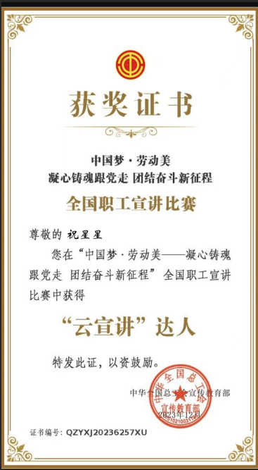 近日,全国总工会公布了“中国梦·劳动美——凝心聚魂跟党走 团结奋斗新征程”全国职工“云宣讲”比赛结果,我公司劳模祝星星同志喜获“云宣讲”达人称号。