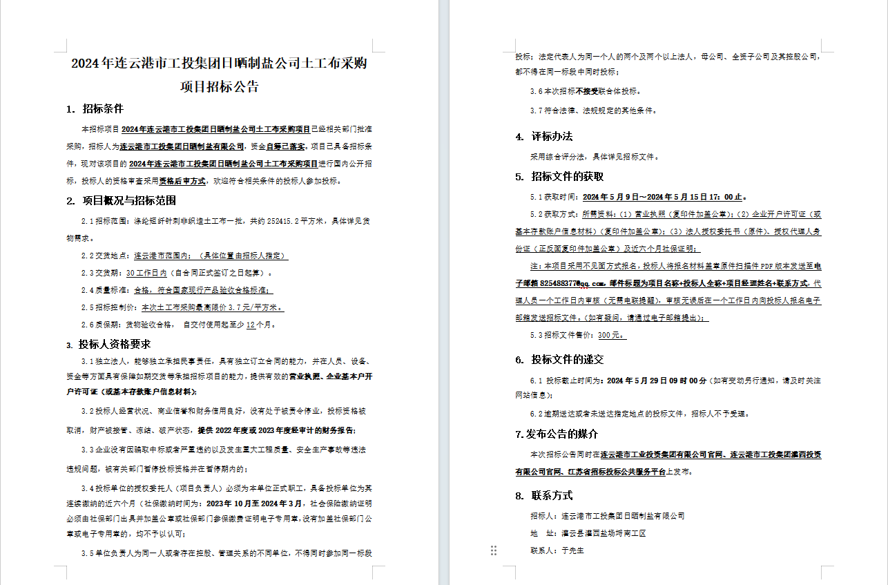 2024年连云港市工投三亿sanyi(中国)日晒制盐公司土工布采购项目招标公告