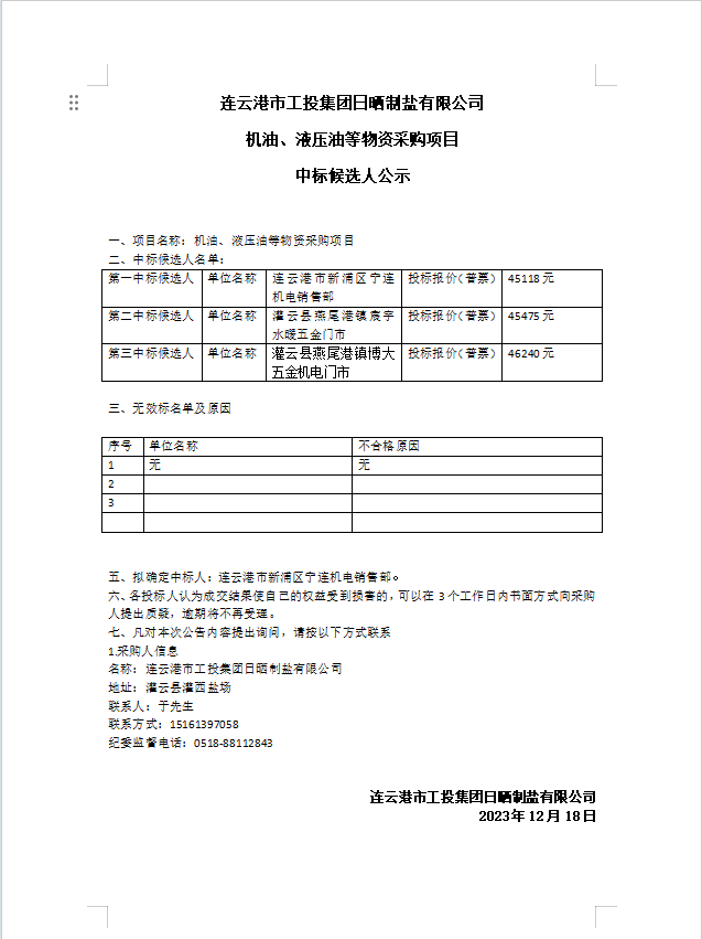 连云港市工投三亿sanyi(中国)日晒制盐有限公司 机油、液压油等物资采购项目中标候选人公示