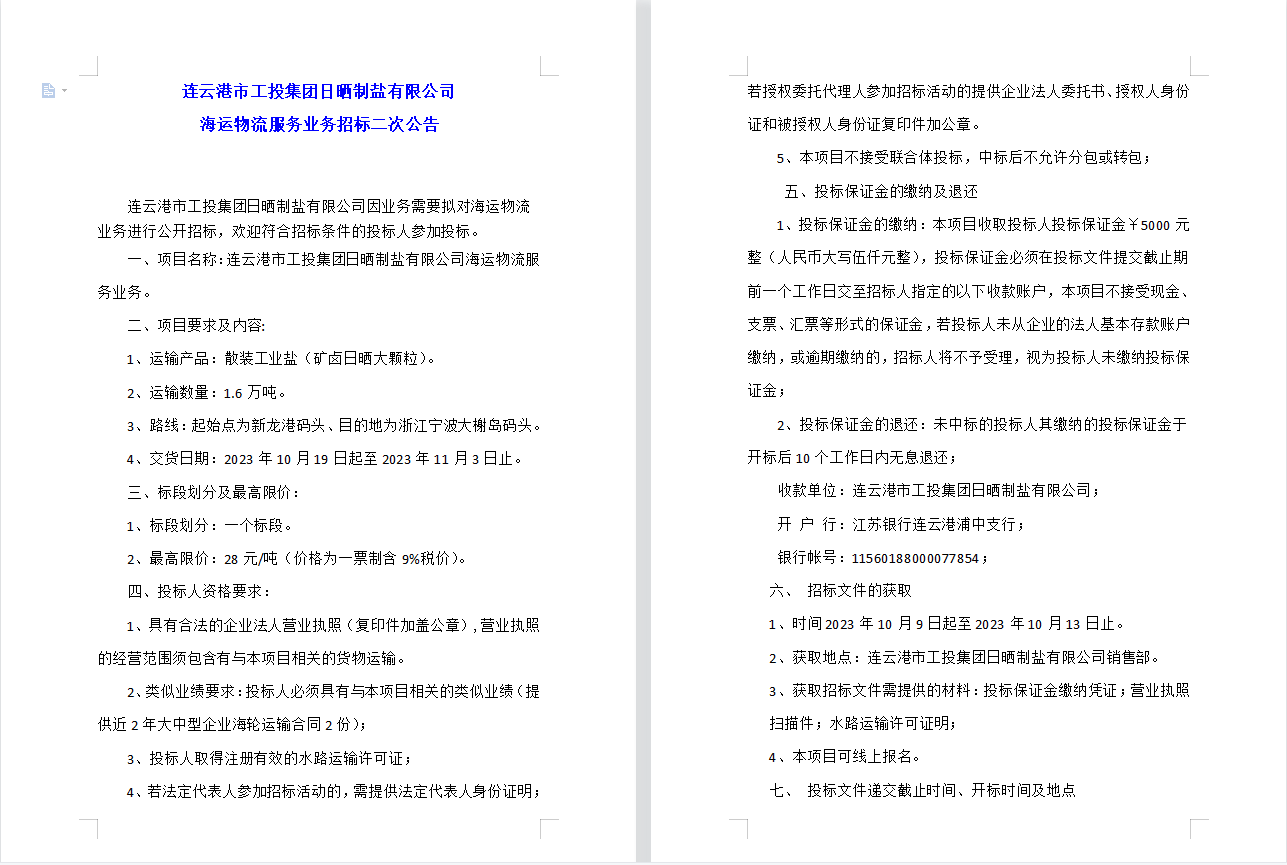 连云港市工投三亿sanyi(中国)日晒制盐有限公司 海运物流服务业务招标二次公告