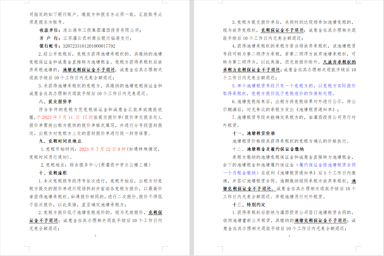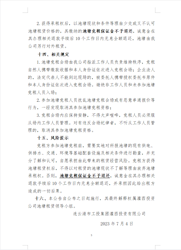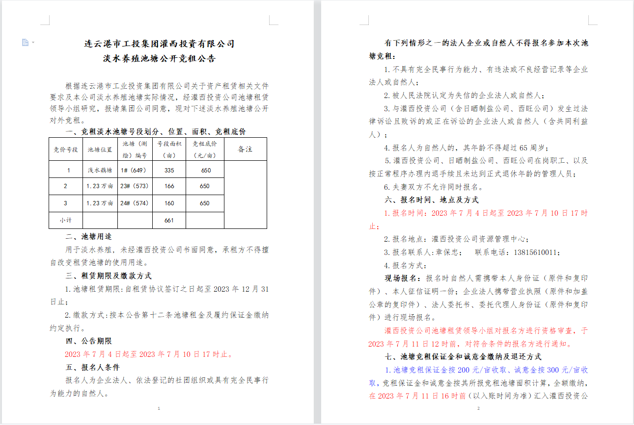 连云港市工投三亿sanyi(中国)灌西投资有限公司淡水养殖池塘公开竞租公告