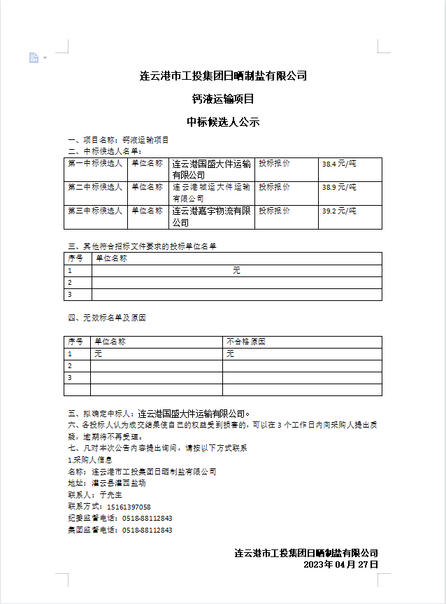 连云港市工投三亿sanyi(中国)日晒制盐有限公司钙液运输项目中标候选人公示