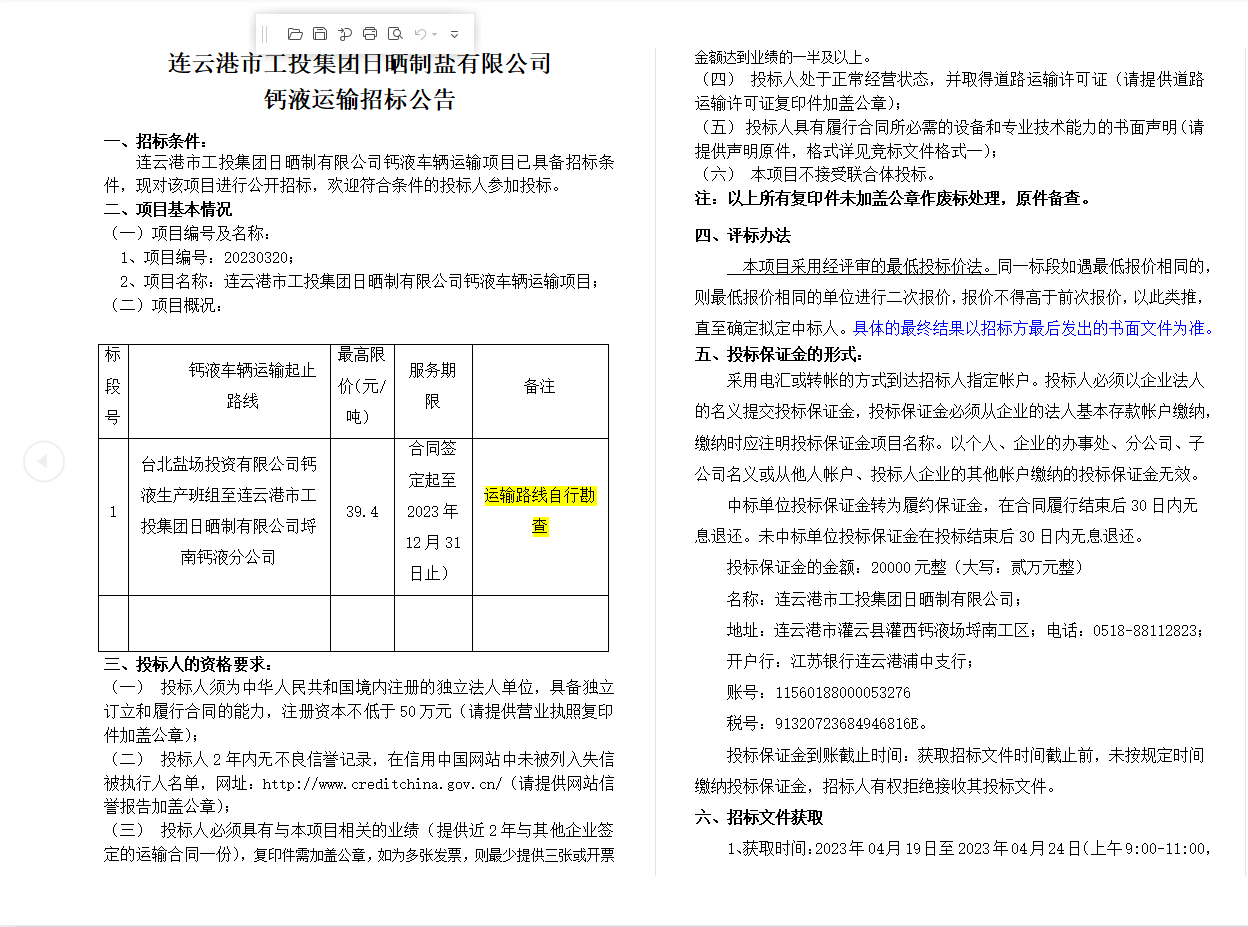 连云港市工投三亿sanyi(中国)日晒制盐有限公司钙液运输招标公告
