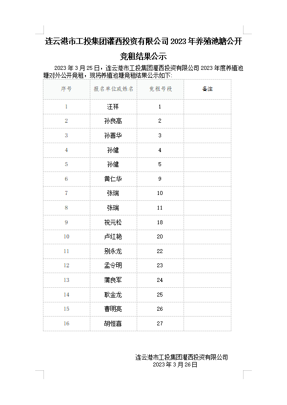 连云港市工投三亿sanyi(中国)灌西投资有限公司2023年养殖池塘公开竞租结果公示