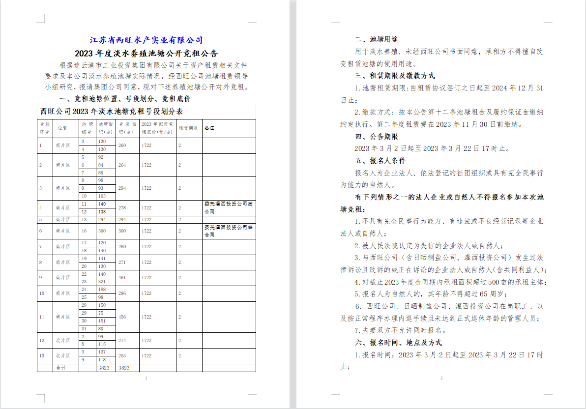 江苏省西旺水产实业有限公司2023年度淡水养殖池塘公开竞租公告