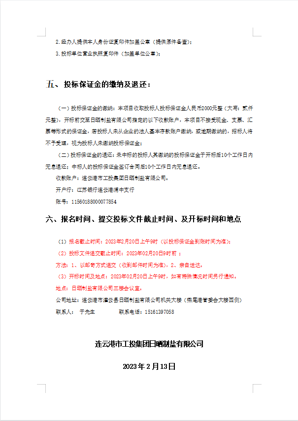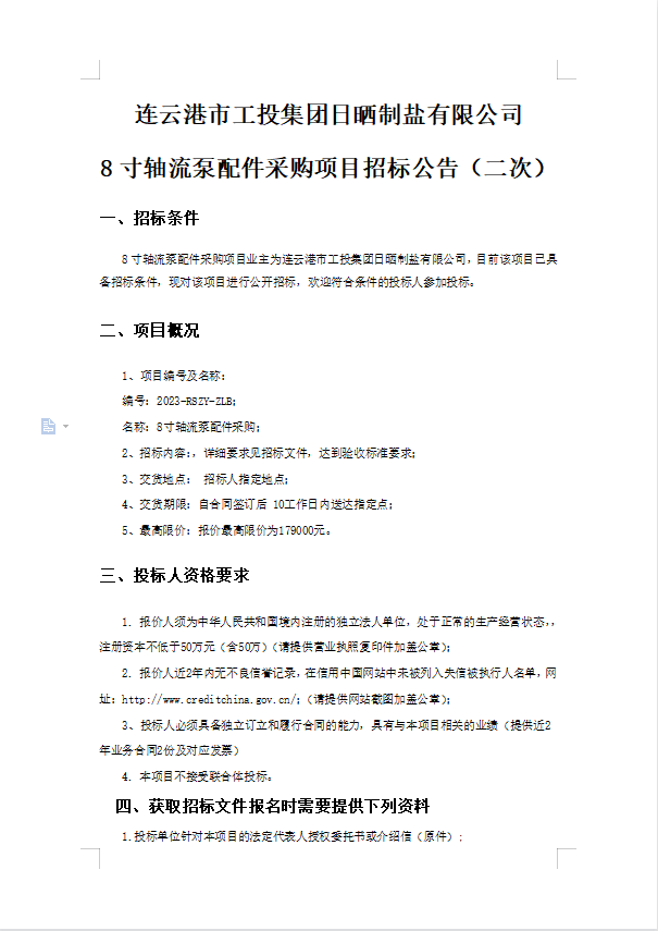 连云港市工投三亿sanyi(中国)日晒制盐有限公司8寸轴流泵配件采购项目招标公告(二次)