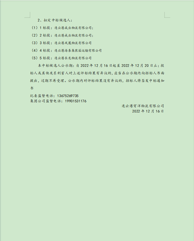 连云港宵洋物流有限公司原盐车辆运输项目拟定候选人公示