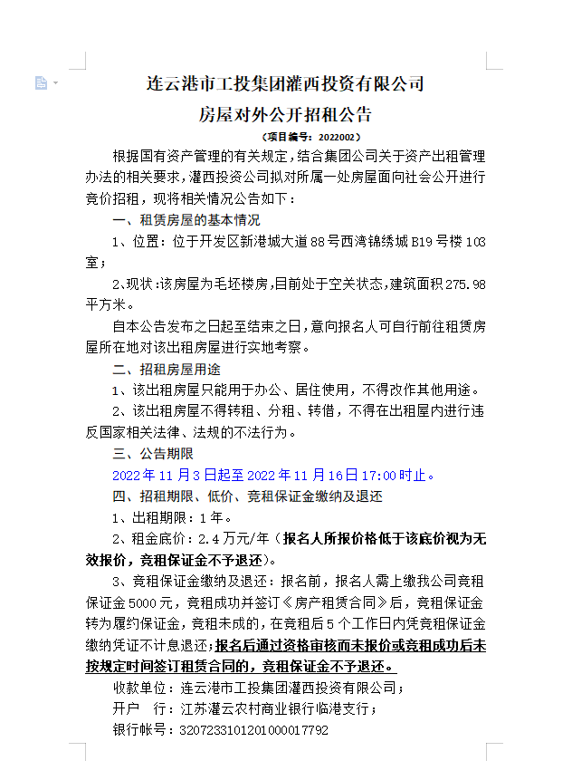 连云港市工投三亿sanyi(中国)灌西投资有限公司房屋对外公开招租公告