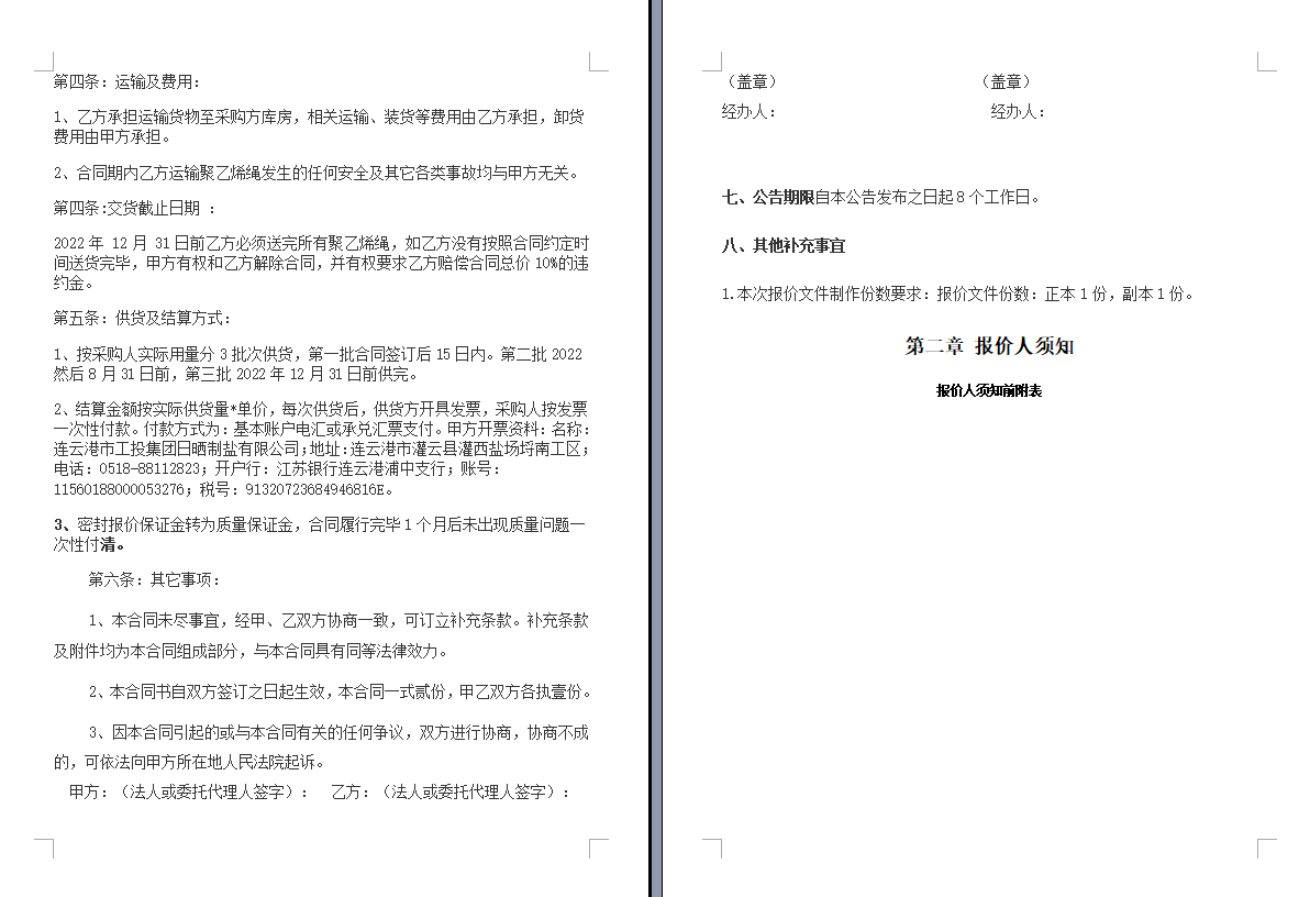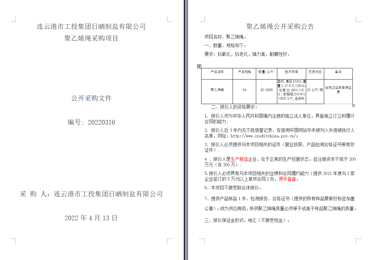 连云港市工投三亿sanyi(中国)日晒制盐有限公司聚乙烯绳采购项目