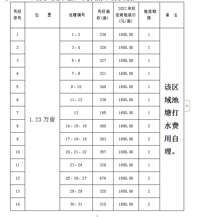 一年期内的池塘租赁价格按获得池塘承租权的竞租方报价执行。
