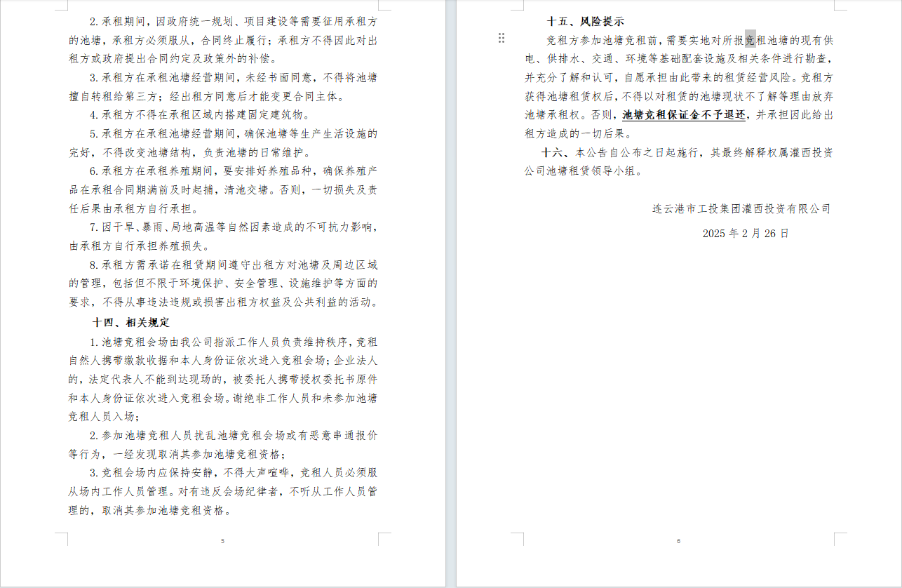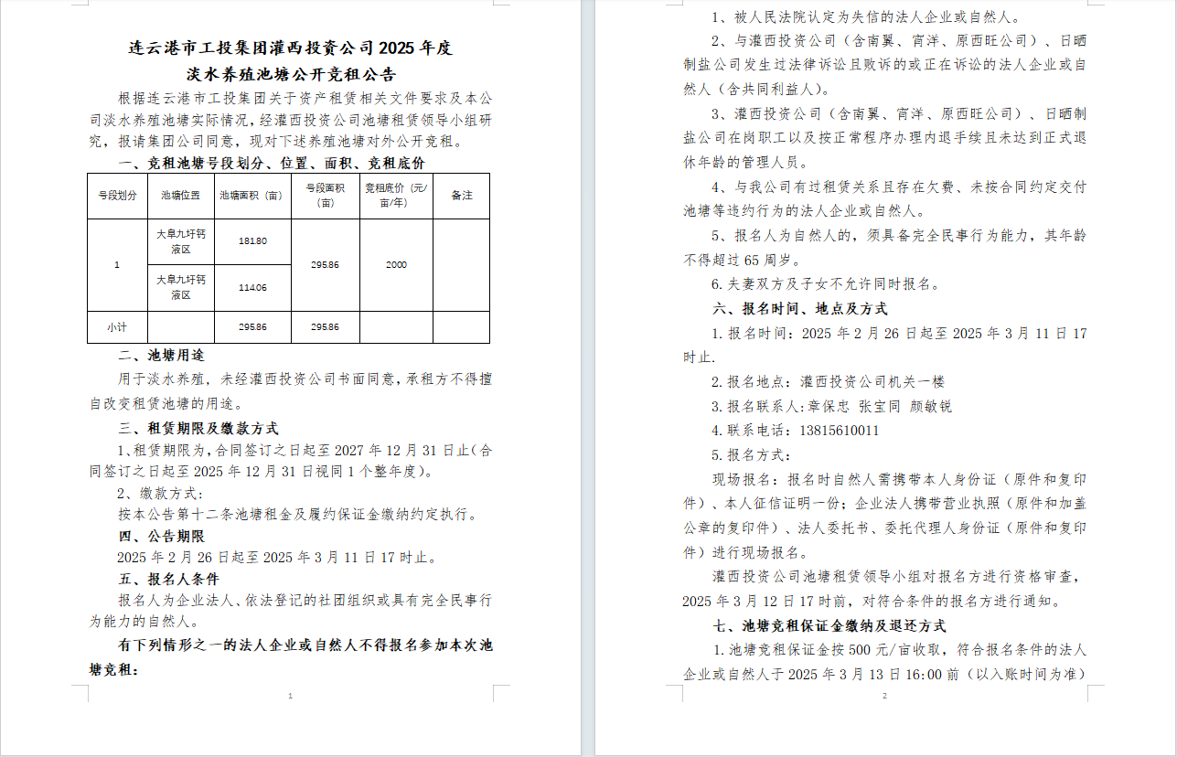 连云港市工投三亿sanyi(中国)灌西投资公司2025年度淡水养殖池塘公开竞租公告