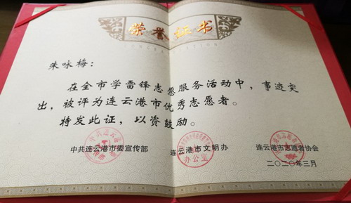 参加疫情防控志愿服务以来,朱咏梅一天都没有休息,已为超过2万名旅客检测体温。由于事迹突出,在全市学雷锋志愿服务活动中,被评为连云港市优秀志愿者。工作期间,渴了不敢喝水,饿了就吃泡面,虽然很辛苦,但是她觉得很自豪,她说:“我是一名预备党员,也是一名国企职工,比起那些奋战在疫情防控一线的医务人员,我做的太少了;当前,全国人民都投入到新冠肺炎疫情防控工作中来,我只是为防控工作贡献了自己的微薄的力量,我相信只要三亿官方网站团结一心、众志成城,就一定能早日战胜疫情,早日打赢这场没有硝烟的战争!(凌家佳)