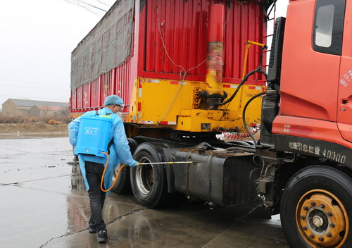 加工盐车间副主任李毕军正在对外来车辆进行消毒。