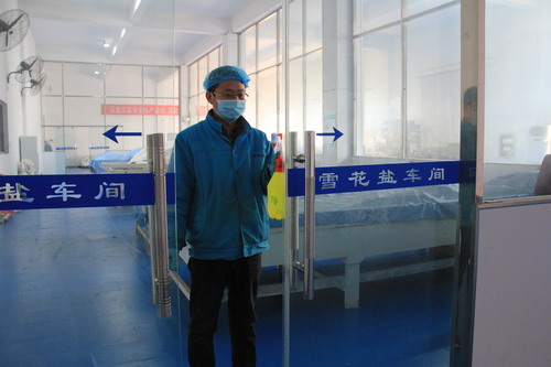 雪花盐车间主任助理万平正在对车间关键区域进行消毒。