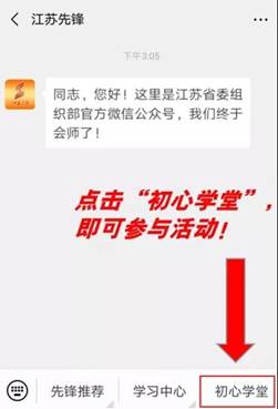 | 各单位党群工作部: 为引导广大党员干部认真学习《习近平谈治国理政》第三卷,推动党的科学理论“飞入寻常百姓家”,“江苏先锋”公众号特开辟“初心学堂”小程序,请组织本单位党员干部8月12日—10月30日登录“初心学堂”小程序一起听音频、读原著、悟原理!(请各位党员登陆后,单位名称统一填写为:三亿官方网站) 第一步:关注“江苏先锋”公众号