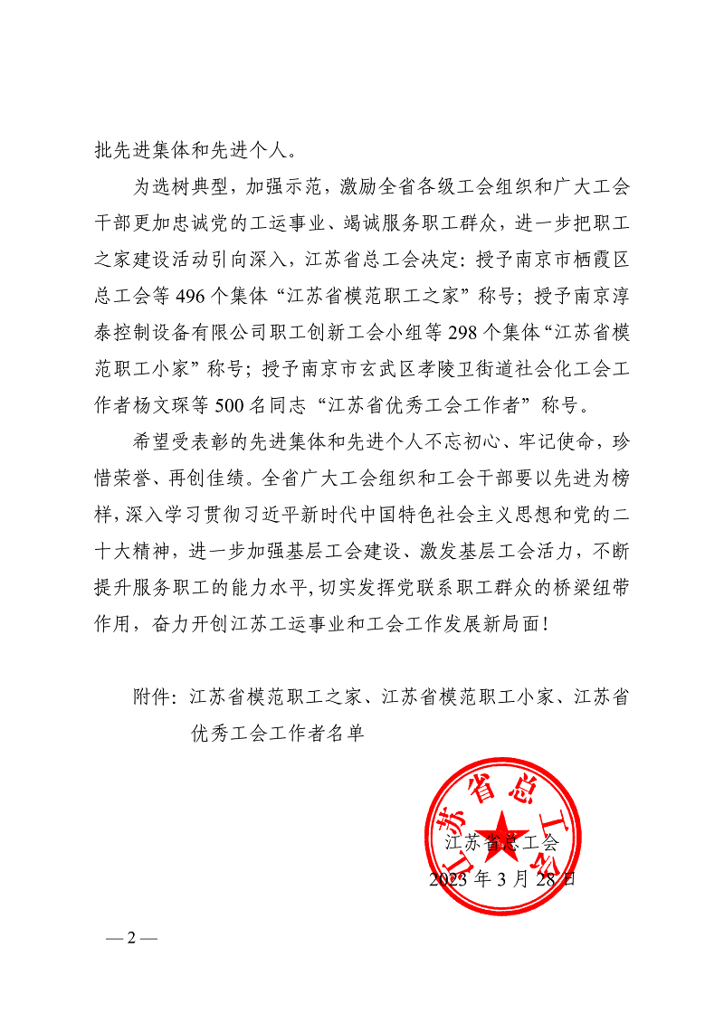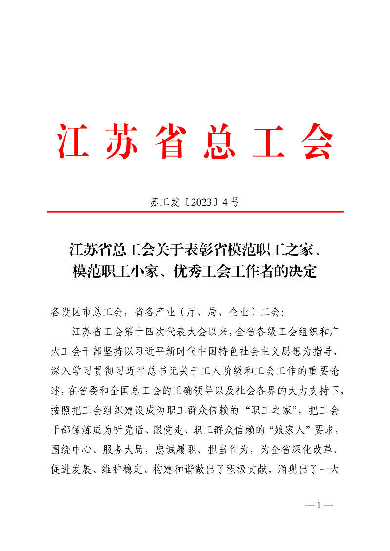 根据《江苏省总工会关于表彰省模范职工之家、模范职工小家、优秀工会工作者的决定》(苏工发【2023】4号)文件精神,青口投资公司工会荣获“江苏省模范职工之家”称号。