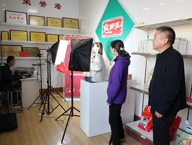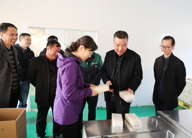 调研组先后参观“盐田玉”抖音带货直播间、“盐田玉”生产加工车间、大新农场水稻收割现场。