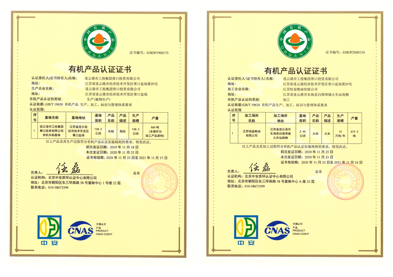 近期,我公司种植的水稻与加工的成品大米顺利通过有机认证,获得有机产品认证证书。