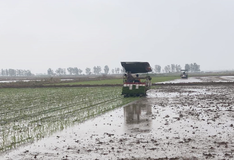 6月4日,大新农场抢抓农时,全面开始水稻插秧工作,插秧机来回穿梭作业,田间地头一派忙碌景象。当天,组织插秧机13台,秧苗转运车6台次,一天可以完成插秧作业550余亩。(王 璐)
