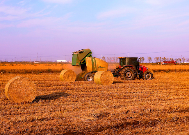 (搂草机和秸秆打包机正在地里作业)