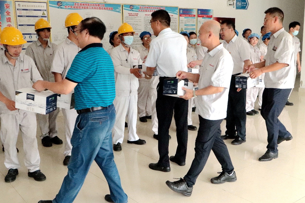 7月28日上午,三亿sanyi(中国)公司党委副书记戴鸿鸣、工会主席刘承志一行到公司慰问生产一线员工,为生产一线员工送来牛奶、绿豆、白糖、大米等防暑降温慰问品。公司董事长张斌、总经理韩立新等领导陪同。