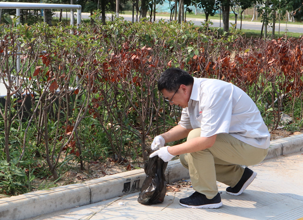 下午的阳光炽热,女同事们戴着帽子,穿着防嗮服或较厚的秋装工作服,时不时的在阴凉的地方捡垃圾。李总穿着夏装工作服一直在阳光下,时而猫着腰,时而抬起膀子抹一下额头的汗,身旁的同事喊他到阴凉地休息一下,他笑着说:“没啥,今天的钙是补足了”,说着又弯下腰干起活来了。