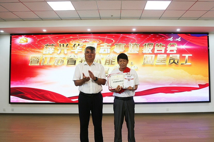 报告会上,公司总经理卞霄宣读了《关于增评薛兴华同志为“四星级员工”的决定》和在全公司范围内开展“向江苏省技术能手薛兴华同志学习”的活动通知。公司党委书记、董事长王德志为薛兴华同志进行了现场授牌颁奖。