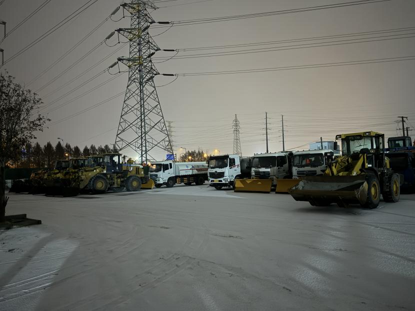 当晚,按照“即下即清、先通后净、保障通行”的清雪除冰原则,在统一调度下,一台台清雪设备有序穿行于道路上,撒布机打头阵,推雪板车紧随其后,将路面积雪进行打通,地上的雪从前向后逐次被清雪车辆推向道路边缘。随后,由人工加以配合,在人机结合方式下,冰雪被装到车上清运走。