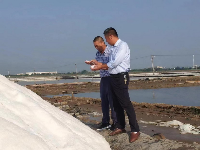 第一片180公亩的晒盐池已经收盐完毕,工人师傅们娴熟有序用塑布对盐廪进行覆盖,预防雨水造成盐斤淌化。